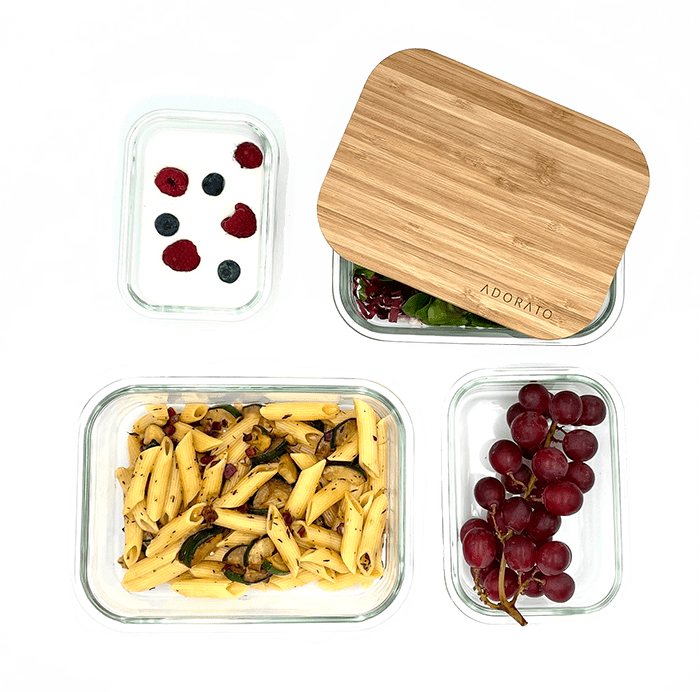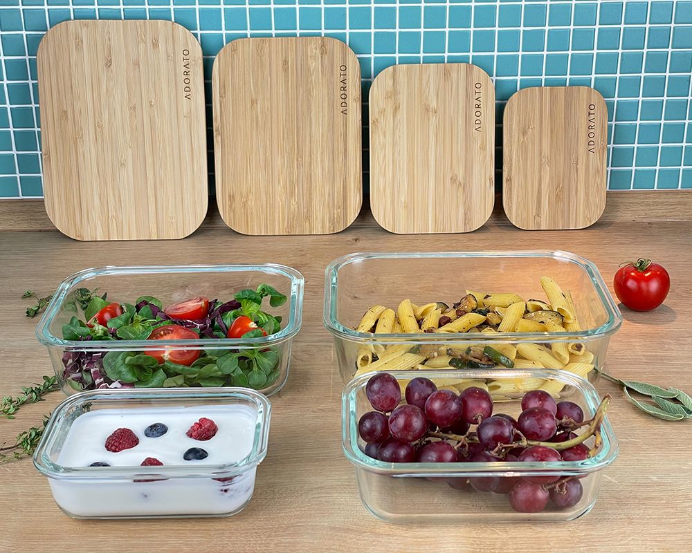 Endlich Ordnung im Kühlschrank Mit Ihren neuen Adorato Frischhaltedosen-Set aus Glas mit Bambusdeckeln bekommen Sie endlich Ordnung in Ihren Kühlschrank. Durch das klare und belastbare Borosilikatglas erkennt man schon von außen was wo aufbewahrt wird. Kein nerviges öffnen und Durchprobieren der einzelnen Lebensmittelbehälter mehr.